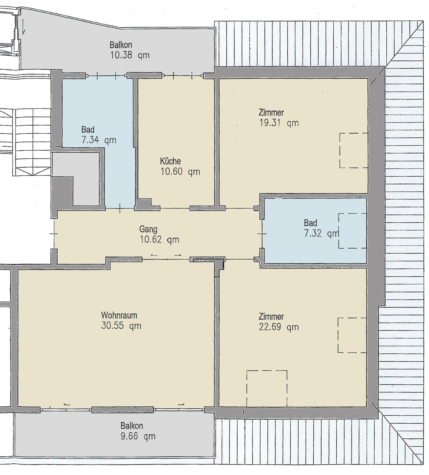 Die Wohnung ist komplett saniert und besteht aus einem Eingang, großem Wohnbereich mit Balkon, Küche (komplett möbliert), zwei Schlafzimmer, Badezimmer mit Badewanne, Badezimmer mit Dusche, getrennete Küche mit Balkon und Zugang zum Aufzug, Keller im Untergeschoss, Parkplatz im Freien.